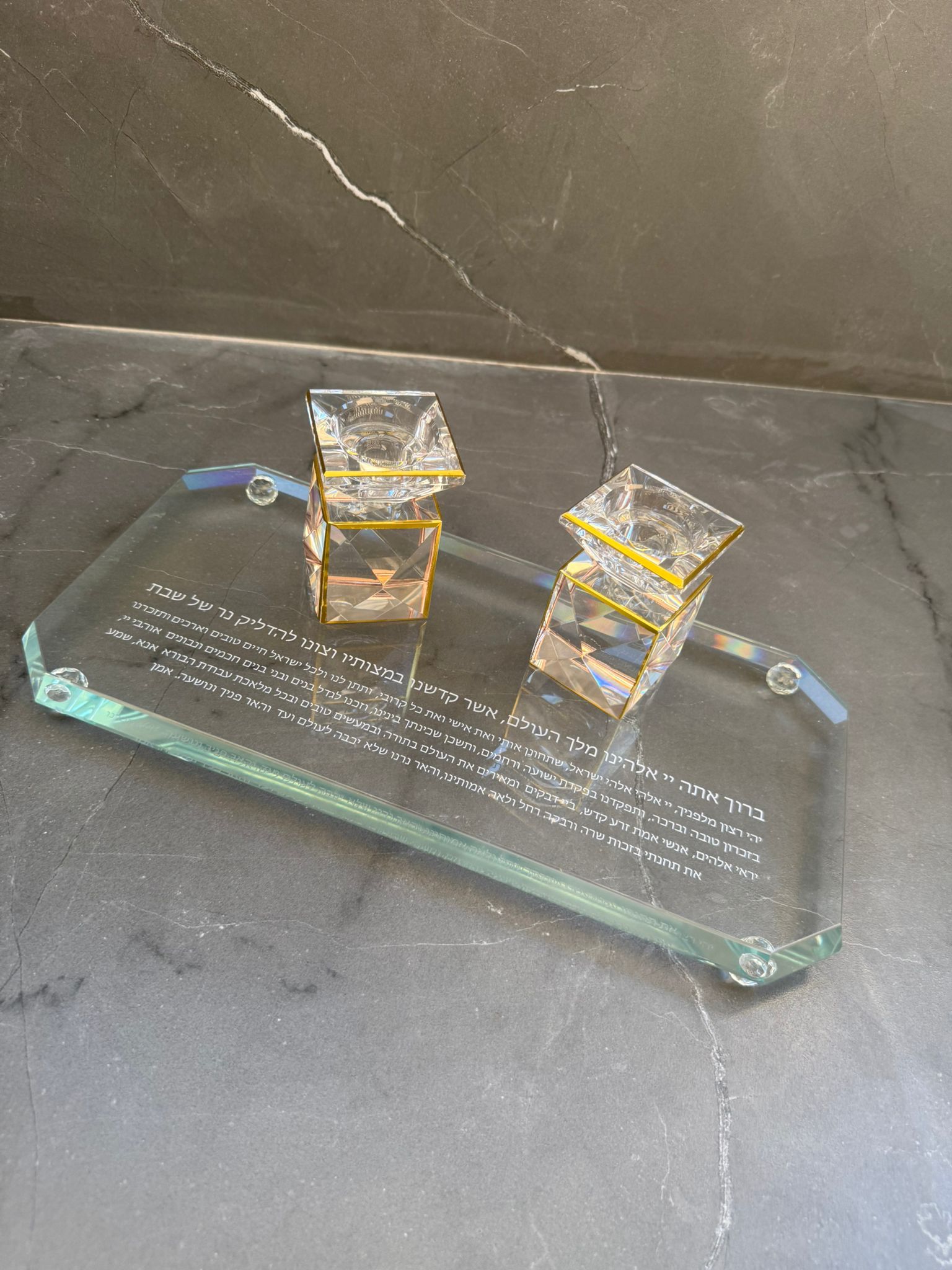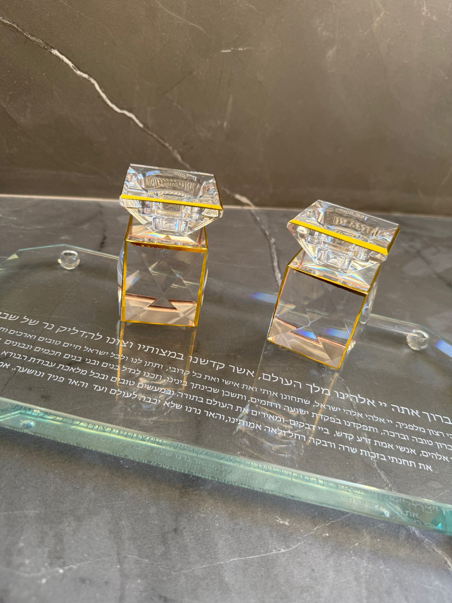 זוג פמוטי קריסטל עם מגש מהודר – שקוף וזהב